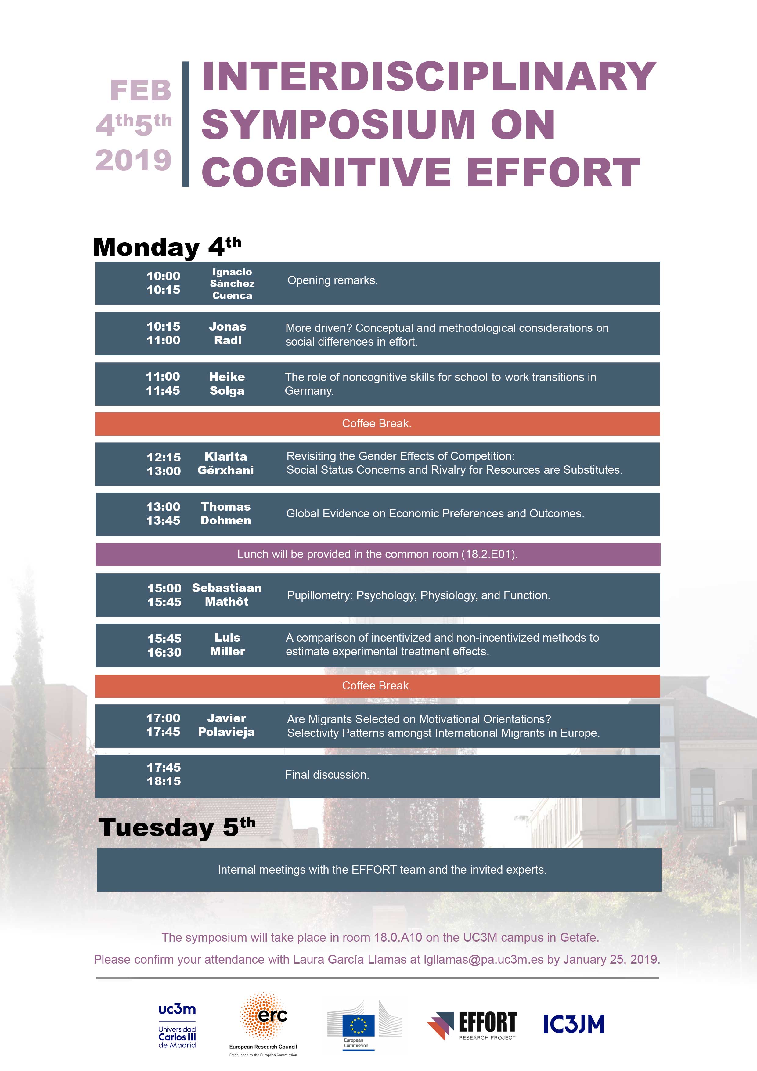 We are pleased to share with you the program for the Interdisciplinary Symposium on Cognitive Effort, which will take place on February 4th and 5th, 2019 in building 18 on the Getafe campus of Carlos III University of Madrid.